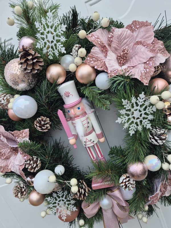 24 inch hand crafted high quality artificial wreath decorated with baby pink and white baubles as well as pine cones and a gorgeous hand made bow to match.
