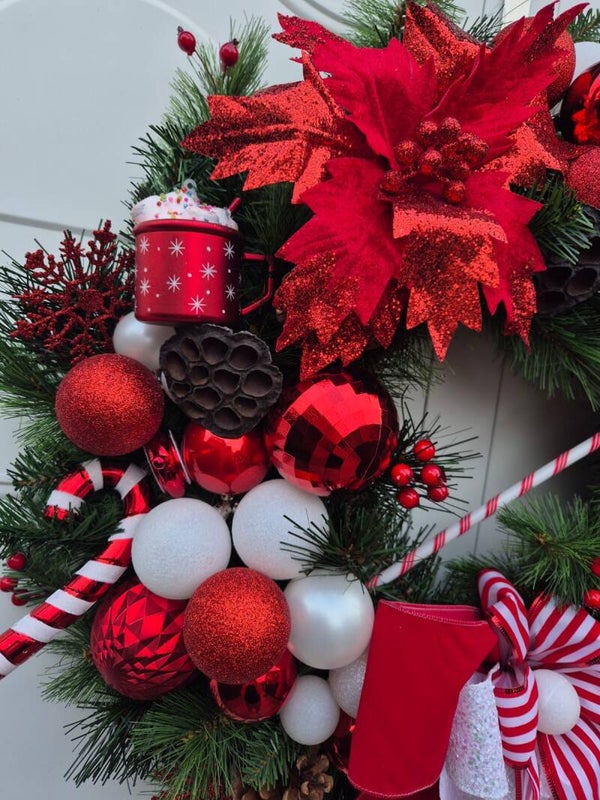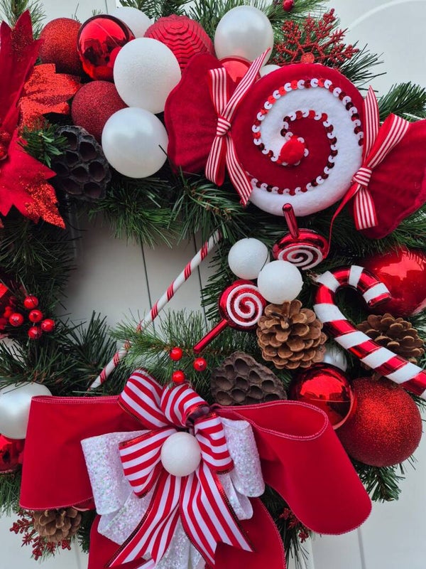 24 inch High quality hand crafted artificial wreath decorated with red and white baubles as well as a range of natural decorations and a perfect hand made bow!