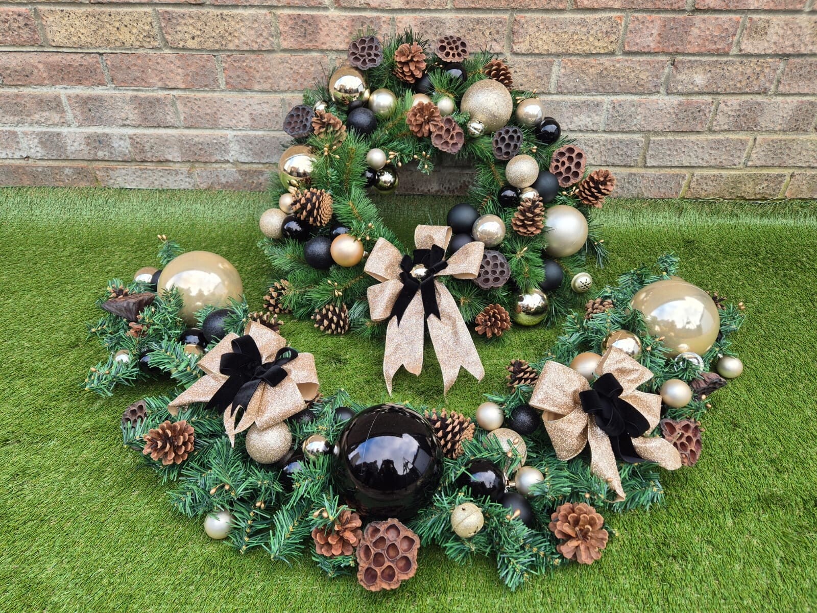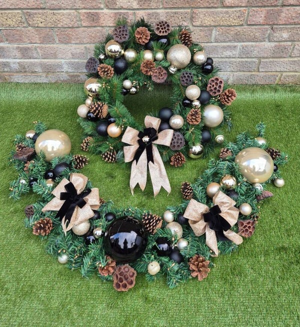 Beautiful 24 inch artificial wreath and 1.3 meter artificial garland decorated with black and gold baubles and bows to match!